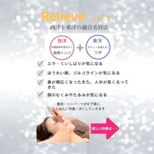 2025/07/21 究極のリフトアップ技法 「Relieve リリーブ」 東洋と西洋のいいとこどりの融合美容法 筋肉・リンパ・ツボを丁寧に たんねんに刺激・ほぐしていきます ・エラ・食いしばりが気になる ・ほうれい線、ゴルゴラインが気になる ・鼻が横広くなったきた、人中が長くなってきた ・顔のむくみやたるみが気になる などなど お試しください。 モニター募集中 ・アンケートにご協力頂行ける方、 ・SNSで写真をご紹介可能な方限定(目隠しOKです) 特別価格でお試しいただけます。
